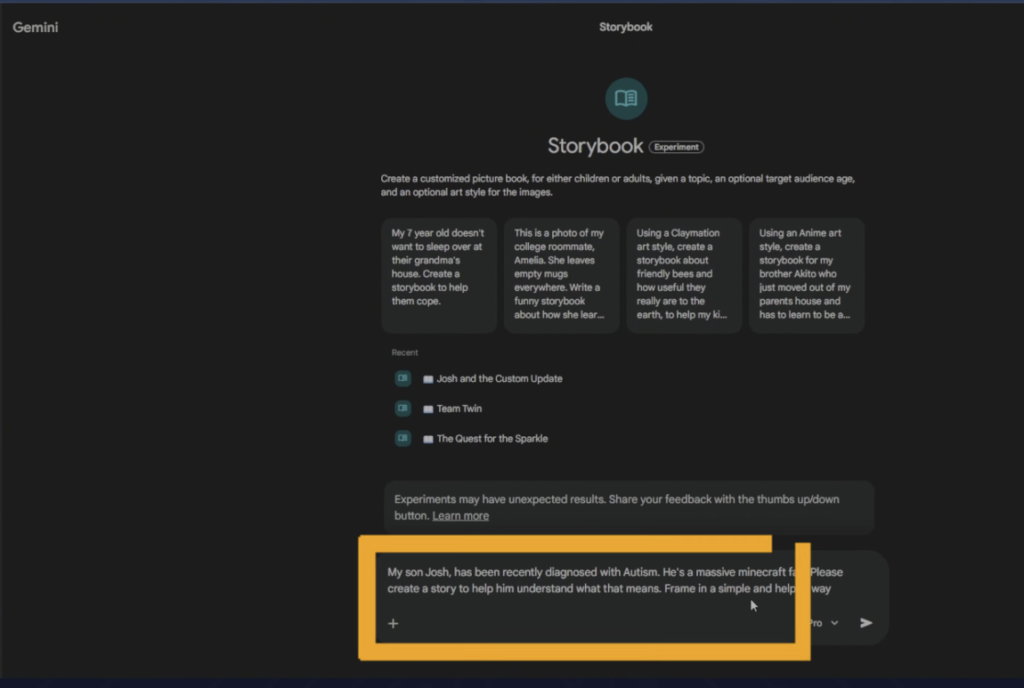 Then prompt it to write the story. Gemini will produce text and, with the right prompt, pixel-art or voxel-style illustrations that match your child’s interests.